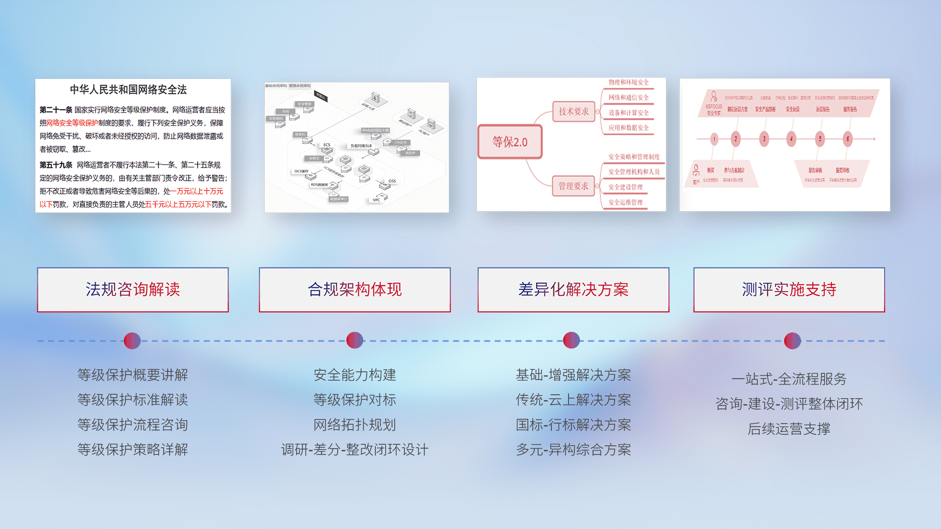 通过专业的法律咨询解读、、、合规架构体现、、、差异化解决方案、、、、测试实施支持等服务,,,,为客户量身打造等保合规体系。。。